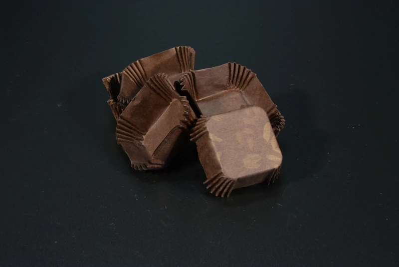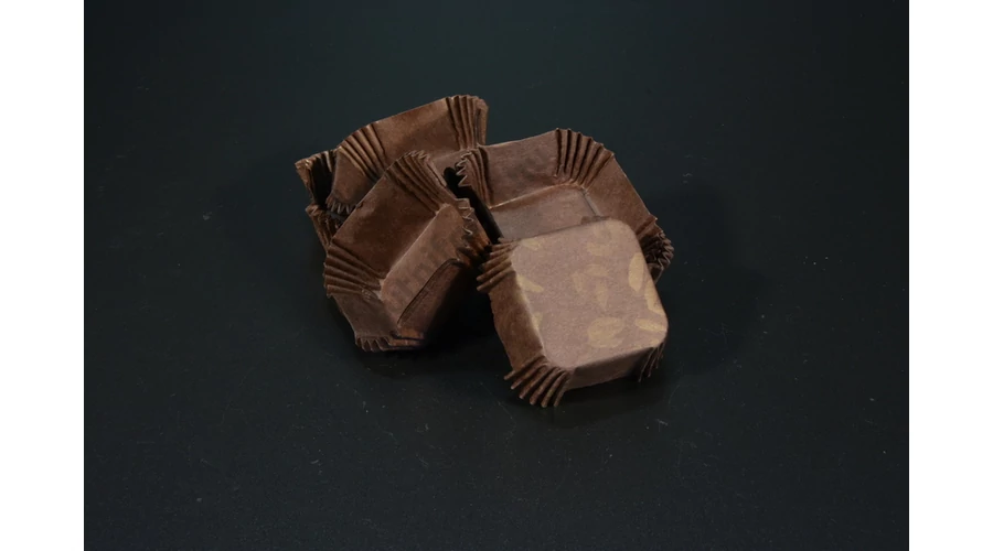 - A 39×39 mm-es négyzetes kapszli zsírálló papírból készült, így megakadályozza, hogy a bonbonok átáztassák a csomagolást. Formája stabil, a mélyített, harmonikaszerű perem jól tartja az alakját, így a desszertek nem csúsznak el. A sötétbarna, mintázott felület prémium megjelenést kölcsönöz, amely kiemeli a kézműves édességek minőségét.